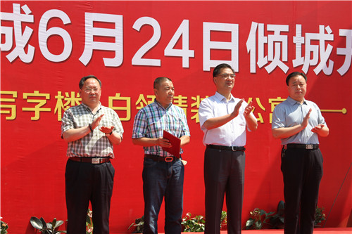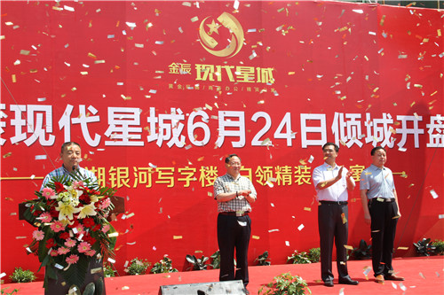 0546房产网(东营房产网)讯 白领精装小公寓,金湖银河写字楼。金辰现代星城6月24日倾城钜献,耀世开盘。当天上午,金辰建设集团董事长周北平先生、副董事长张延国、副总经理陈怀亭及副总经理宋乃佩等主要领导亲临开盘现场,与现场参与者共同见证时下盛况。