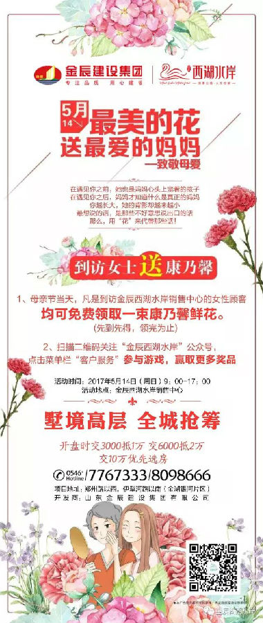 0546房产网(东营房产网)讯 5月14日,最美的花要送给最爱的妈妈。在母亲节即将到来之际,位于西湖公园旁、东营市一中新校区以南的金辰西湖水岸特推出女士到访送康乃馨活动。凡5月14日母亲节当天到访金辰西湖水岸销售中心的女性顾客均可免费领取康乃馨鲜花一束(先到先得,领完为止),同时关注“金辰西湖水岸”微信公众号,点击菜单栏“客户服务”参与游戏,即可赢取更多奖品。