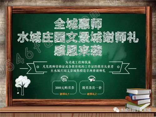 全城惠师。水城庄园文景城谢师礼,感恩来袭,凡凭教师资格证或各教育机构工作证的教育从业者,至水城庄园文景城售楼处享两重谢师礼:3000元购房券、精美茶具一套。