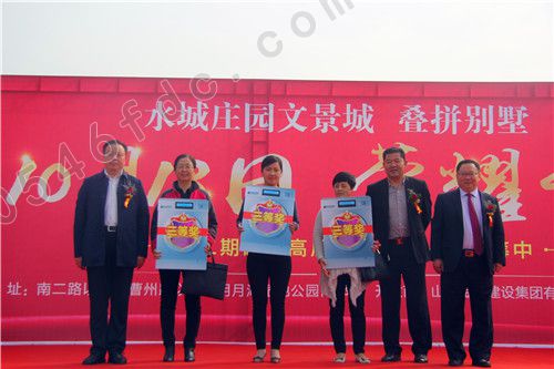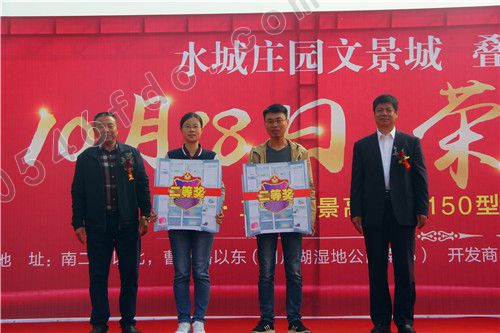 上午9时30分许,激动人心的抽奖活动正式开始。在工作人员引导下,认购水城庄园文景城二期叠拼别墅的业主们陆续上台参加抽奖,中奖率高达100%。在著名主持人赵伟激情号召下,一二三等奖以及幸运奖获奖客户一一被抽出,并接受大家的欢呼。随后,金辰建设集团和建大集团领导分别为获奖新业主颁奖并合影留念。