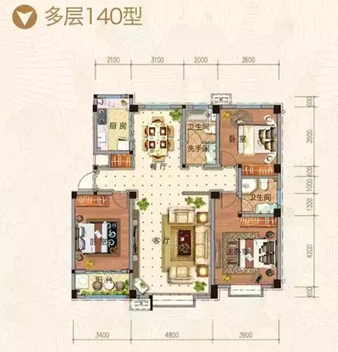 【金辰胜泰花苑】河景多层140型 三室两厅两卫户型图