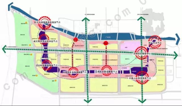 欢乐水岸情景商业服务节点、威尼斯风情体验节点、湿地科普教育服务节点、东南亚风情体验节点、江南水乡商业服务中心、印象山水办公酒店服务中心、魅力水岸节点