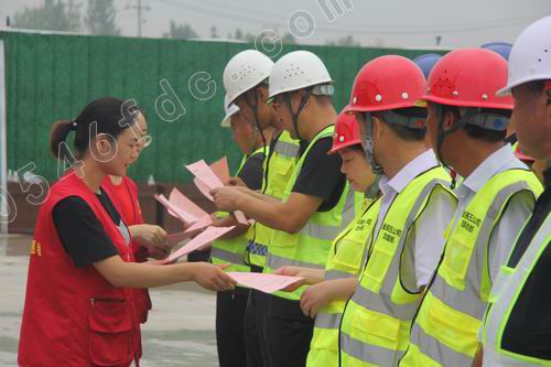 山东金辰建设集团慰问农民工“夏送清凉”活动:志愿者发放宣传资料