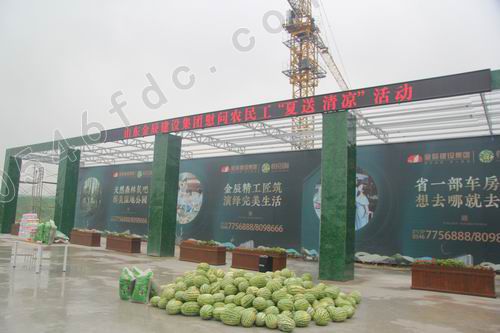 8月7日上午8时30分,山东金辰建设集团慰问农民工“夏送清凉”活动物品配送车就将众多西瓜、一袋袋的绿豆、毛巾等物品运送至悦辰国际项目现场。